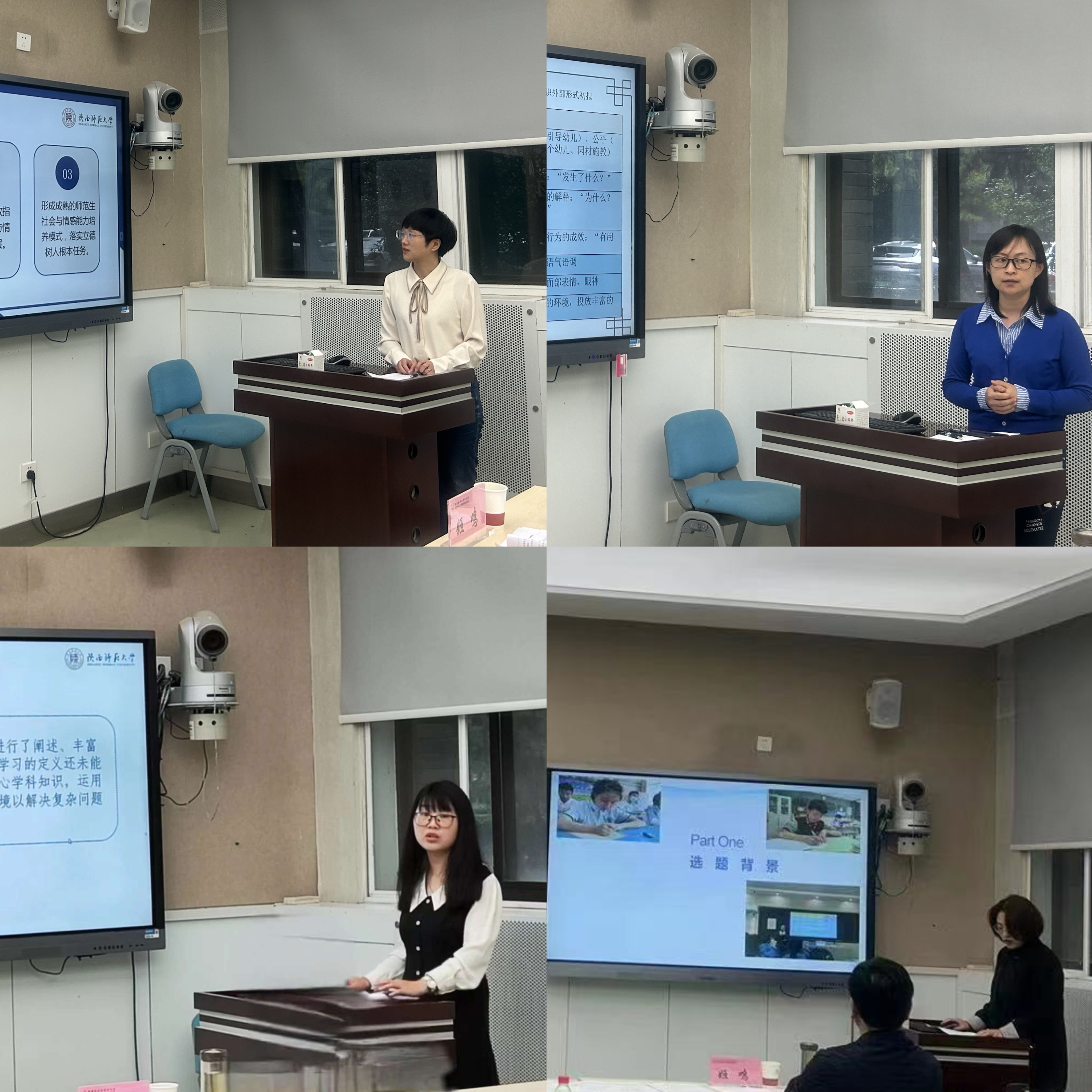 会上,三公 2022年研究生创新基金资助项目博士生一般项目负责人辛爽、蔡李娜、唐科和葛晓穗四位教育博士生,分别汇报了《思维地图在聋生英语课堂教学中的实践探究》《指向核心素养的中学英语课堂深度学习路径研究》《立德树人视域下师范生社会与情感能力培养研究》《基于师幼互动的幼儿教师实践性知识发展研究》课题的研究设计和思路。