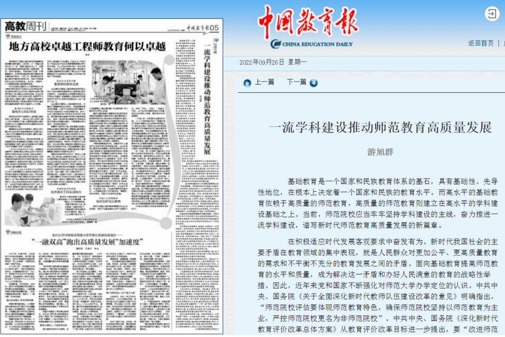 26日,《中国教育报》在05版高教周刊专版,刊登了我校校长游旭群的署名文章《一流学科建设推动师范教育高质量发展》。文章阐释了推进一流学科建设的重要意义,介绍了我校“四维”学科新布局,彰显了我校不断为推动西部基础教育振兴发展作出新贡献的使命担当。