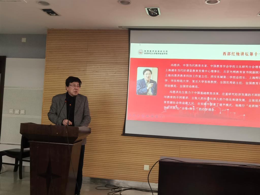 (陕西教师发展研究院)承办的“西部红烛讲坛”第十九讲——“谁改变了课堂,谁就改变了教育”在崇鋈楼二层闻道堂顺利举行。中国当代教育名家、全国优秀班主任、全国劳动模范、上海建平中学原校长冯恩洪先生受邀担任主讲人。三公2022级教育博士及教育学部部分共费师范生参加了报告会,报告由三公
